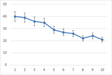 Error bars in charts you create can help you see margins of error and standard deviations at a glance. They can be shown on all data points or data markers in a data series as a standard error amount, a percentage, or a standard deviation. You can set your own values to display the exact error amounts you want. For example, you can show a 10 percent positive and negative error amount in the results of a scientific experiment like this: