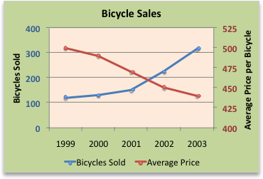In this chart, the primary vertical axis on the left is used for sales volumes, whereas the secondary vertical axis on the right side is for price figures.