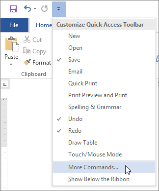 In Word, click the Customize Quick Access Toolbar icon, and then click More Commands.