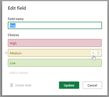 Choice: Create a drop-down list of 2 to 20 options that can include characters and emojis. You can drag and drop options to change their order. Note that if you remove an option from your Choice field, any task that had that option will now have a blank in that Choice field. Also, you can't use this field to build reports.