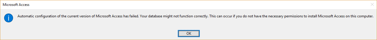 "Automatic configuration of the current version of Microsoft Access has failed. Your database might not function correctly. This can occur if you do not have the necessary permissions to install Microsoft Access on this computer."