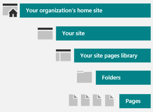 Here's a simplified illustration of how pages are stored in SharePoint. Your organization probably has multiple sites, and each site has its own pages library. The library may have folders where pages are organized.