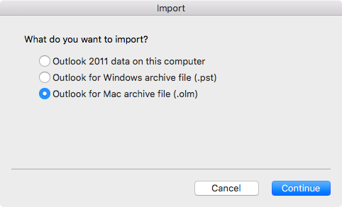 In the Import box, select Outlook for Mac archive file (.olm) > Continue.
