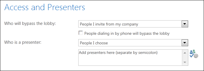 When you’re creating a new meeting, under Access and Presenters, select who can bypass the lobby, and who can be a presenter.