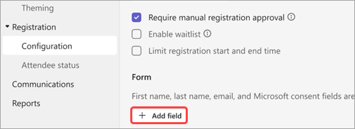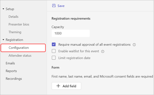 Add structure to your webinar with additional registration settings and requirements. To modify attendee registration, open the webinar from your Teams calendar and go to Registration > Configuration.