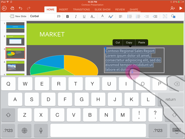 With the onscreen keyboard activated, tap anywhere in the text box to position the cursor. |
