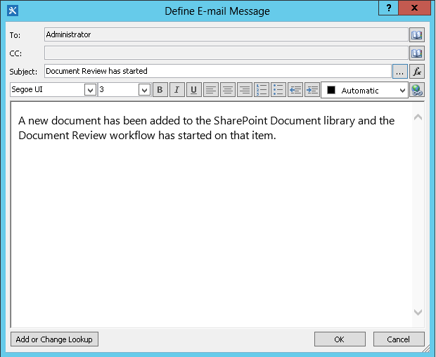 If you supply static addresses in the To and Cc fields of your email, then any time that you need to change the recipients, you must open the workflow in the Workflow Designer and make the changes manually. If the addresses will change frequently, it is a better practice to use workflow lookups in the To and Cc fields. Lookups can reference addresses from a field in the current item, from a field in an item in another list or library, or from workflow variables.