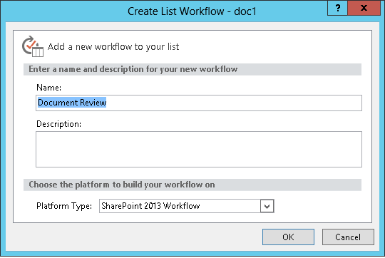 On the Create List Workflow dialog, enter a name and description for the workflow, and then make sure to set the Platform Type to SharePoint 2013 Workflow.