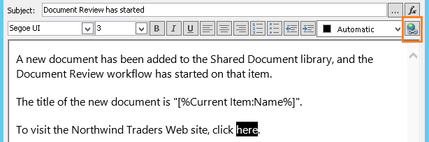 To use the new variable in the Define Email Message dialog, enter or paste the text within which you want link to appear into the email body. Select the text, and from the formatting menu, select Edit Hyperlink. Select [fx] button, or select ellipses button [...], and then select Add or Change Lookup.