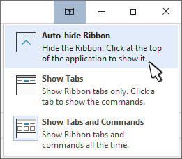When the ribbon is visible, in the lower-right corner of the ribbon, click the Ribbon Display Options icon.