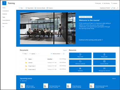 The Training and courses site template is a team site that serves as an internal home page for your training course. Prepare course participants and students for specific learning opportunities by sharing course resources, news, and events.