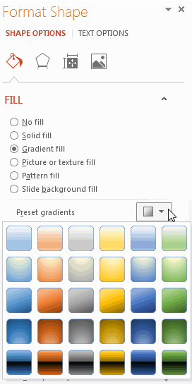 You have lots of options for adding gradients, from simple built-in gradients to ones you create yourself. You can add gradients to basic shapes and text boxes, as well as shapes that are part of charts, SmartArt, and WordArt. You can quickly apply preset gradients, or you can create your own gradient fill with custom colors and specified brightness, transparency, gradient directions, and positioning.